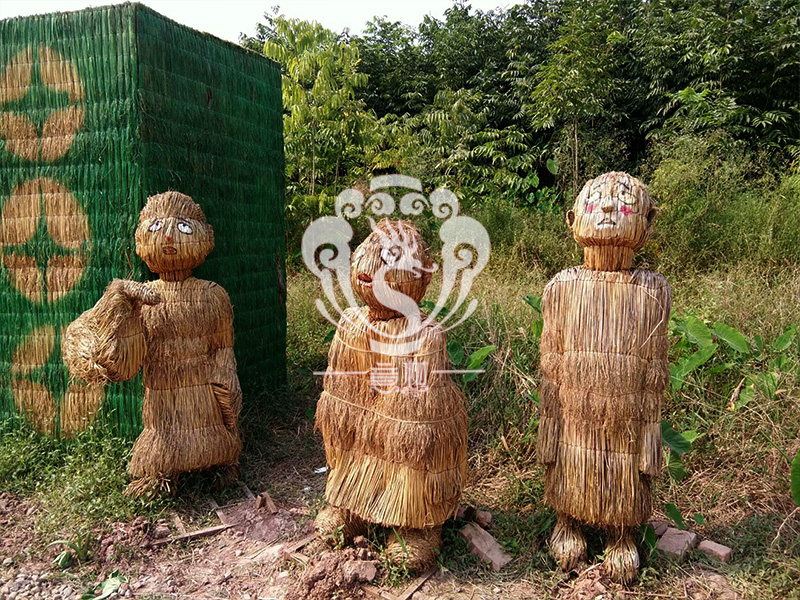 現(xiàn)在的精致稻草人藝術(shù)通常是由專業(yè)美術(shù)老師的造型放樣,然后由焊工師傅焊接出立體造型造型,然后以稻草或者稻草繩為材料編捆制作而成。