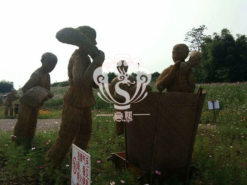 現在的精致稻草人藝術通常是由專業美術老師的造型放樣,然后由焊工師傅焊接出立體造型造型,然后以稻草或者稻草繩為材料編捆制作而成。
