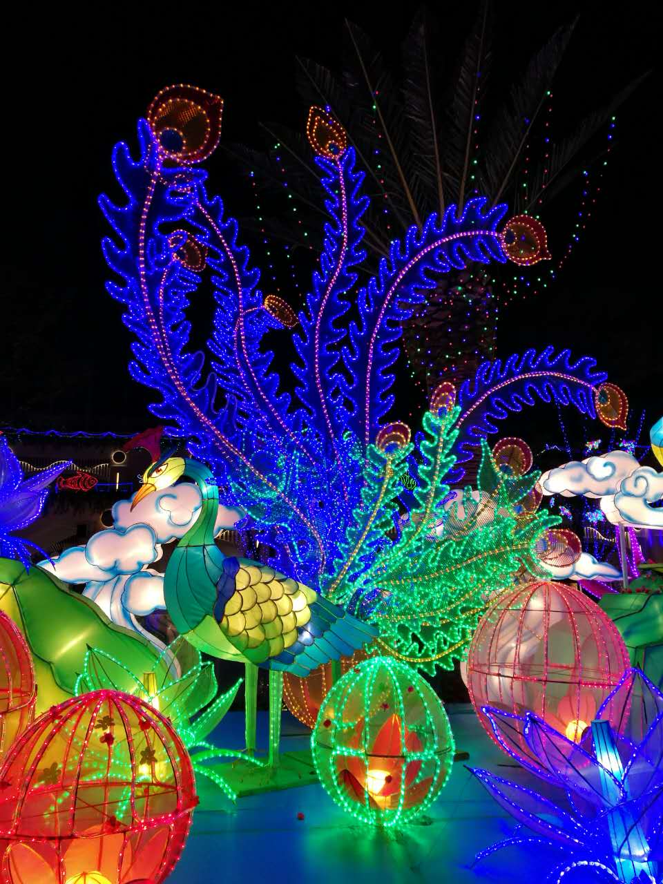 1、“孔雀迎賓”燈組通過孔雀形體的轉動,結合牡丹花的盛開把云南和滇池會展的地域主題發(fā)揮的淋漓盡致。
