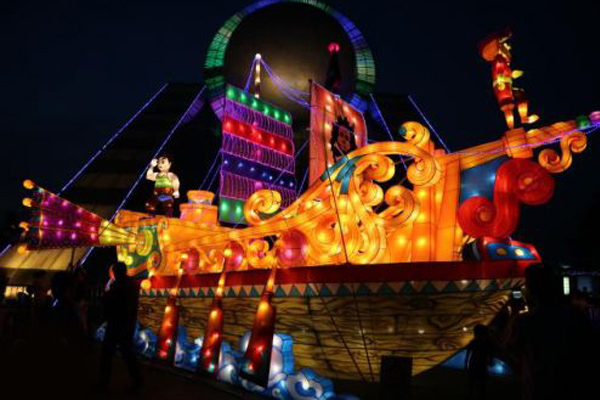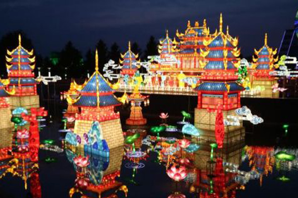 其中,“大唐華章”是名副其實(shí)的“明星”。這組長40米,高15米的彩燈由皇宮和荷花等“美景”組成,還原了大唐盛世時(shí)期,唐明皇與楊貴妃出宮游玩的情景。燈組座落于水上,和水中倒影交映,亦真亦幻。
