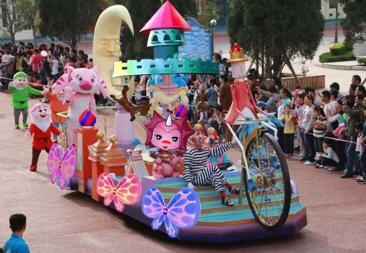 《夢游仙境》長15米高6米寬6米玻璃鋼彩繪花車。城堡是孩子們對童話世界幻想和向往,月亮城堡里呈現(xiàn)出小動物們歡樂玩耍的場景,旋轉(zhuǎn)木馬,小動物們彈琴歌唱,帶動著游客歡快喜悅的心情。
