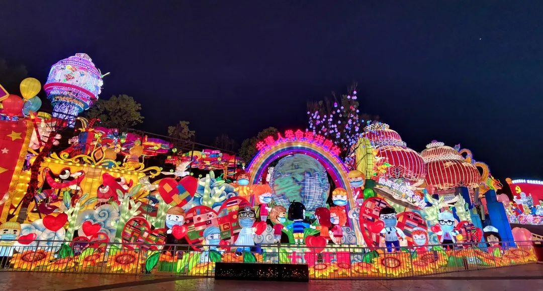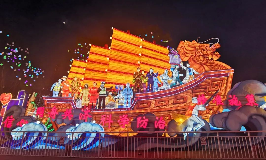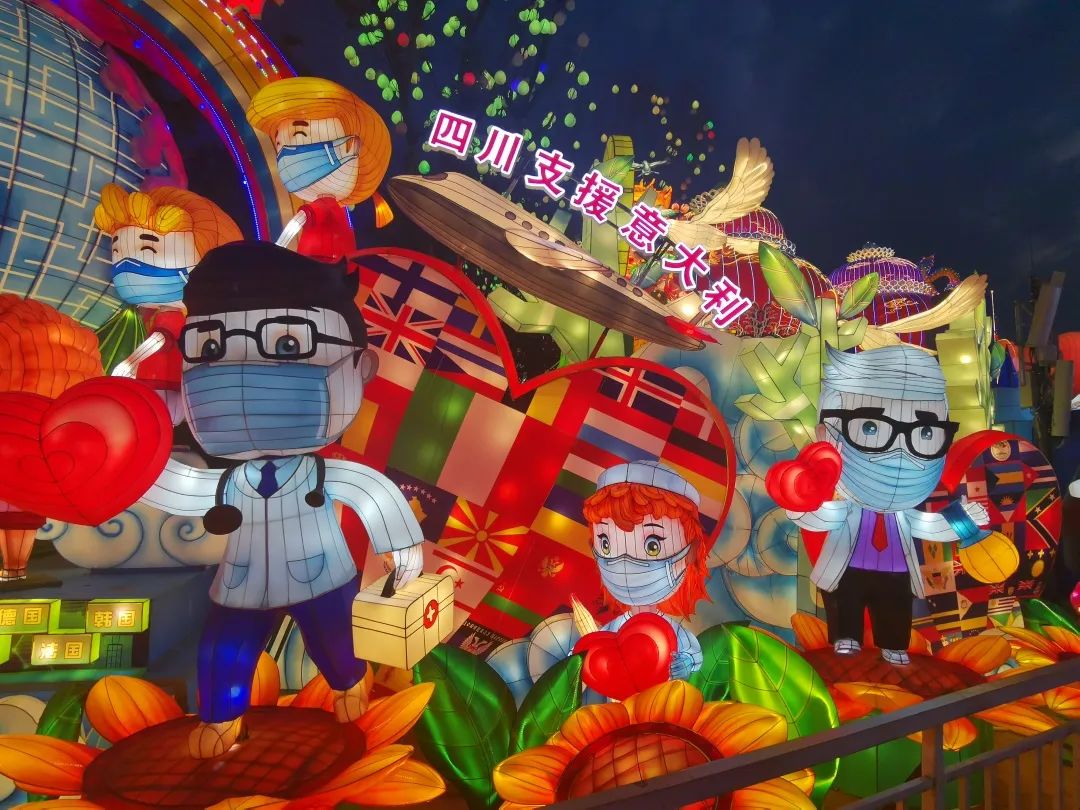 此次燈會以“春回大地、燈耀世界”為主題,是全國首個抗疫主題燈會,自貢燈會用精心創(chuàng)作的一組組彩燈還原了抗疫一線的“戰(zhàn)士們”的大無畏精神。