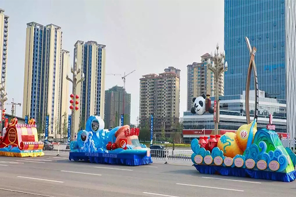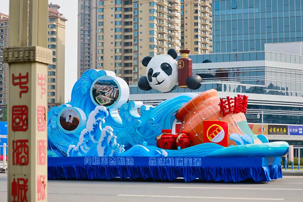 4月12日,在四川瀘州西南商貿(mào)城五區(qū)門口,五輛“酒”主題花車??吭诼愤叄茐?、酒瓶、酒葫蘆、釀酒高粱等與酒相關(guān)的元素,使得花車造型精美新穎、極具視覺沖擊力,可謂一車一故事,一車一風(fēng)景。