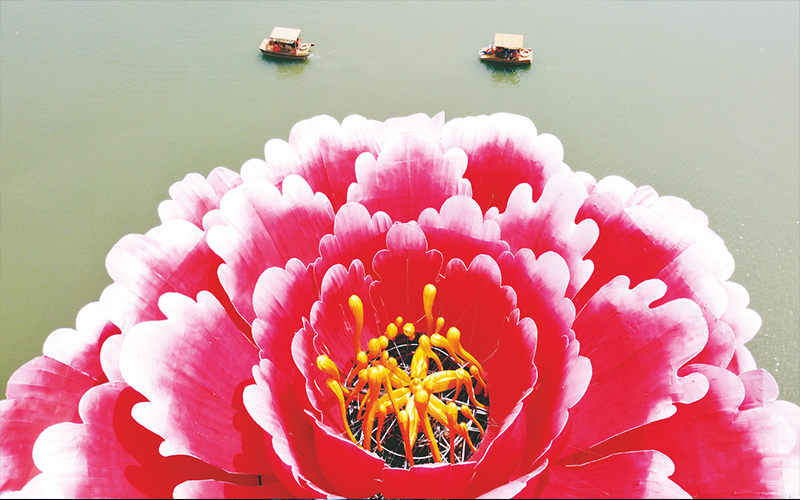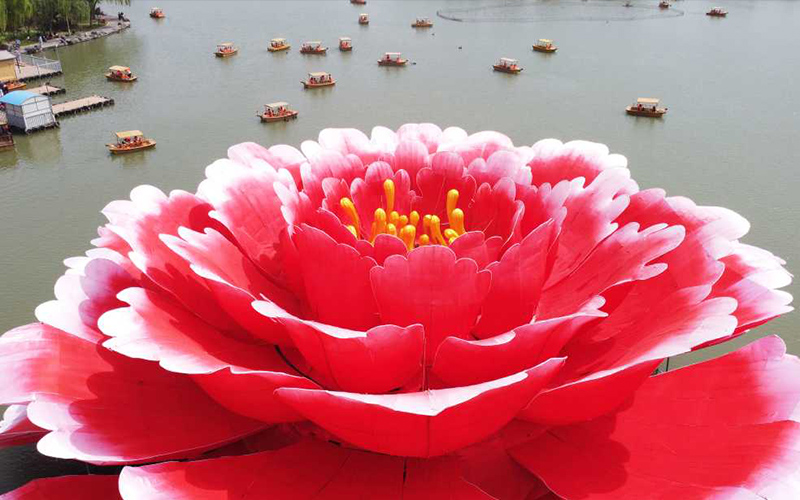 4月16日,河南省洛陽市隋唐城遺址植物園滴翠湖,一朵直徑36米,高13米的巨型牡丹造型亮相,吸引游客紛紛前來打卡。據(jù)介紹,這朵巨型牡丹“培育”歷時30天,花型以洛陽本土牡丹“洛陽紅”為參考,內(nèi)部有燈光裝置,可供游客晚上觀賞。